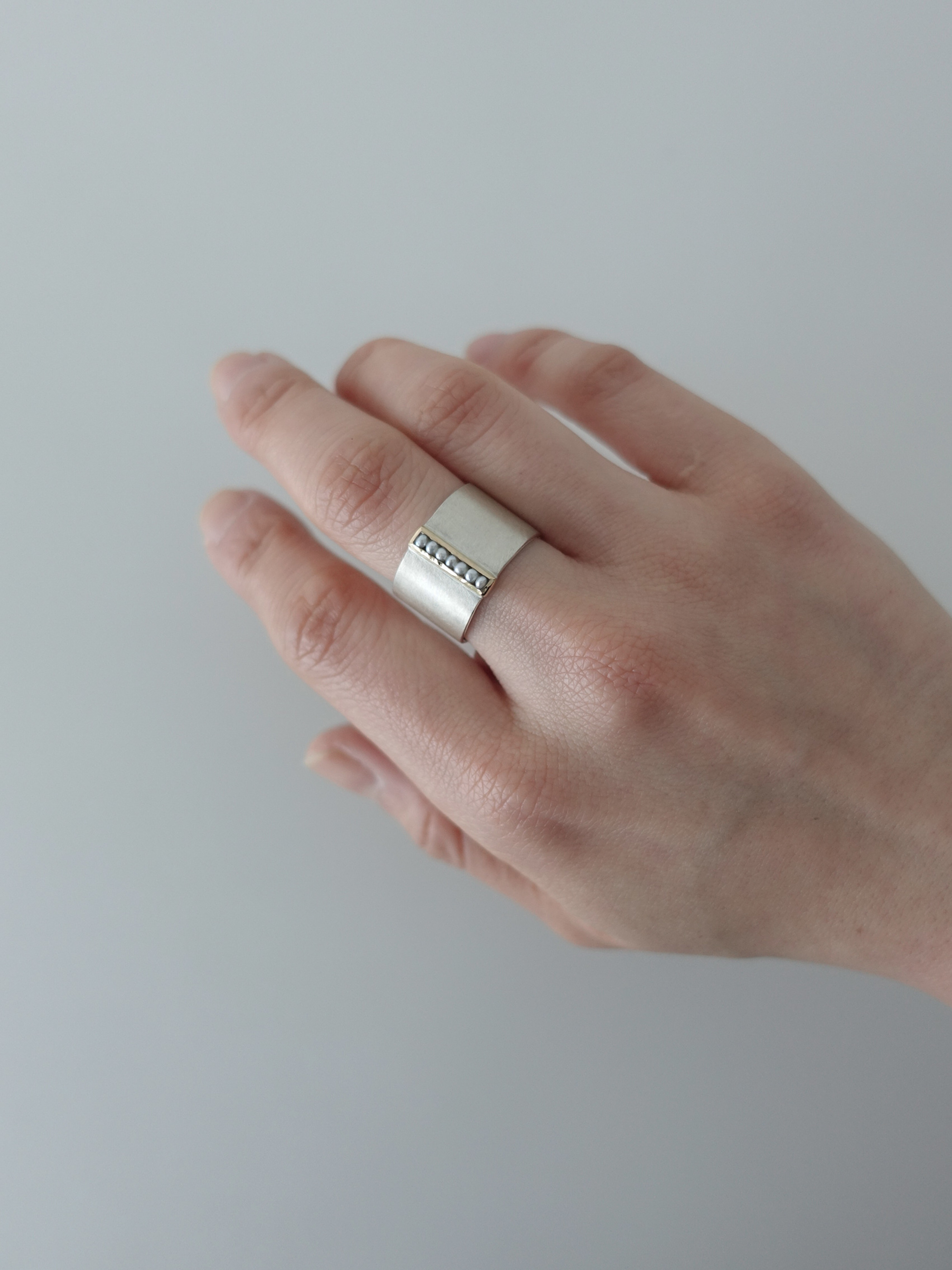 幅のあるデザインながら軽やかな着け心地で、リング部分をマットに仕上げることで印象が重くならず、手元をすっきりと見せてくれます。